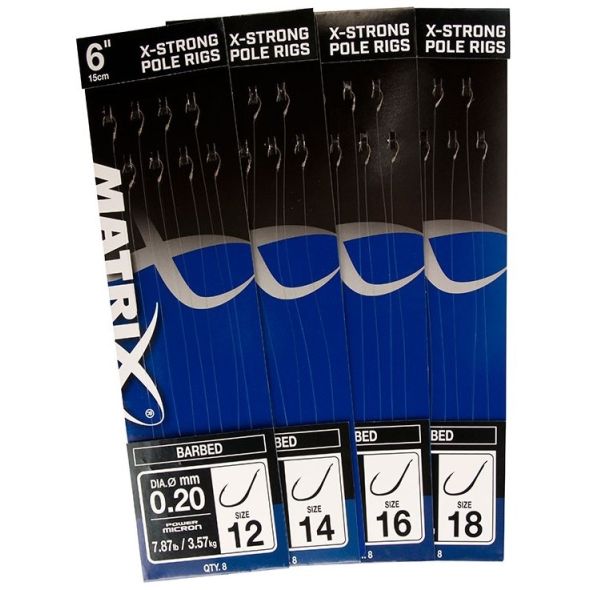 Matrix Barbed X-Strong Pole sunt riguri gata legate, special concepute pentru pescuitul la crap sau stationar (cu varga ori rubeziana) cu pelete, miniboilies-uri, boabe de porumb ori momeli vii. Lungimea strunei este de 15cm, fiind construita cu fir Power Micron de 0.20mm si carlige japoneze cu barbeta model SW Feeder. Rigurile sunt compatibile cu penarul HLR Hooklength Case din gama Matrix.