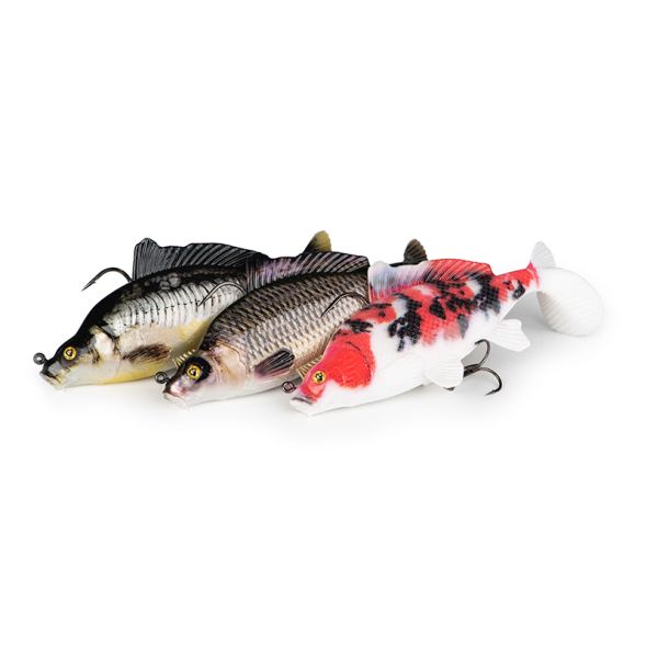 Swimbait din gama Replicant Softbait, cu finisaje incredibil de realistice, ce imita la perfectie un crap de mici dimensiuni. Este echipat in partea superioara frontala cu un carlig offset iar in partea inferioara cu o ancora tripla super-ascutita. Corpul aerodinamic se termina cu o coada flexibila, ce emite vibratii puternice in apa, irezistibile in fata oricarui pradator.
